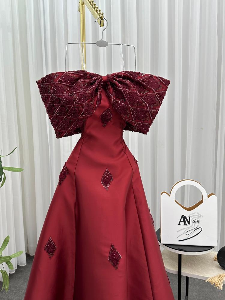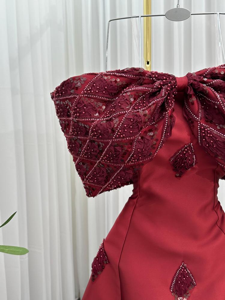 التصميم العلوي:يتميز بتصميم أوف شولدر (كتف مكشوف) مع تفاصيل تطريز فاخرة ولامعة على الصدر والأكتاف، مما يضيف لمسة من البريق والأناقة.