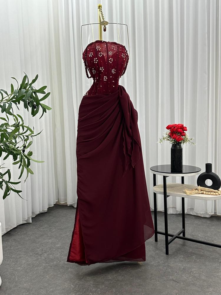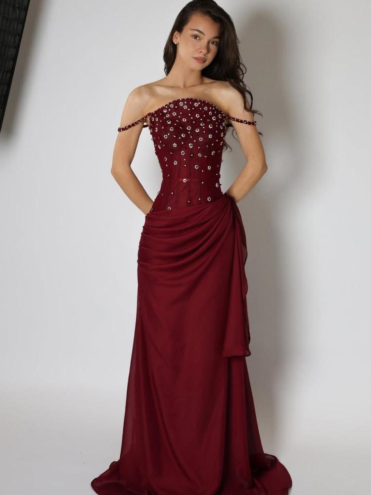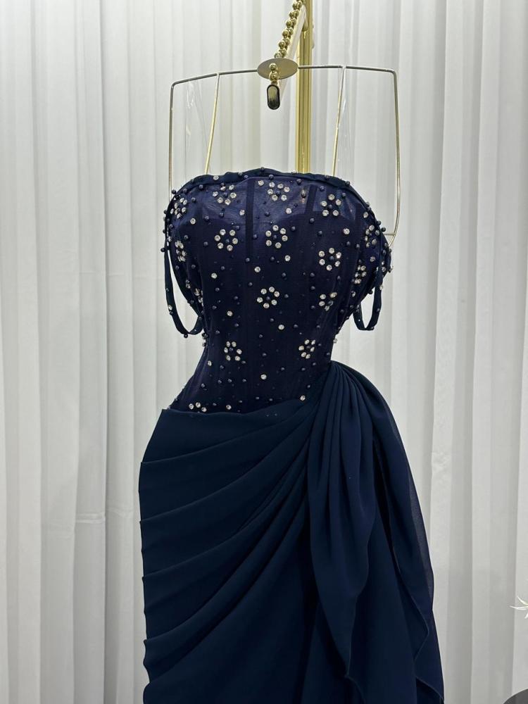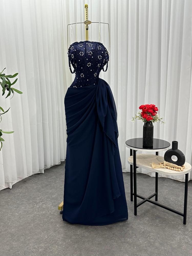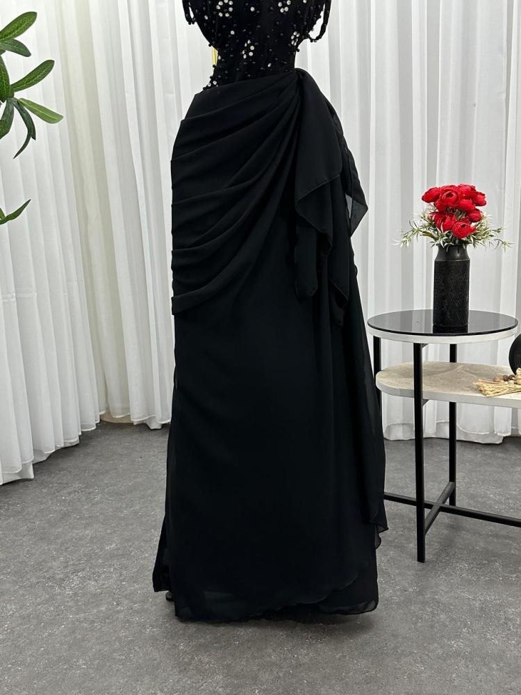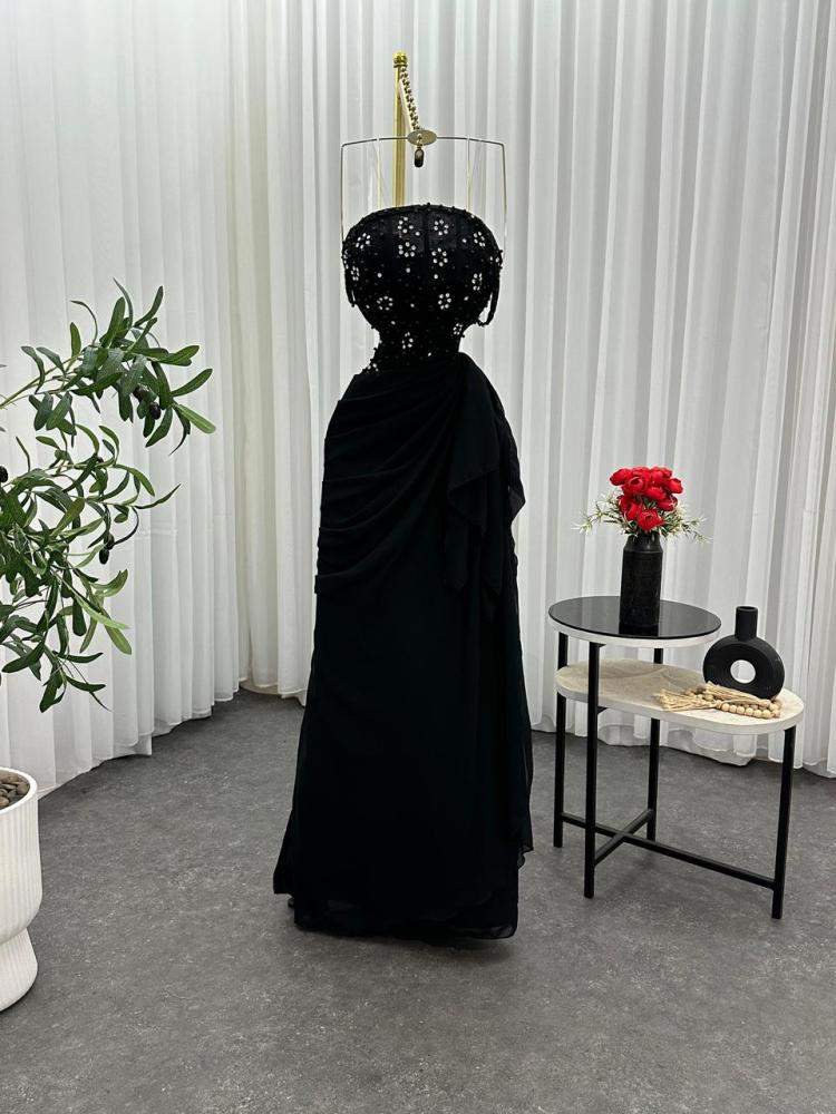 الفستان المعروض في الصورة هو فستان سهرة طويل باللون الأسود، يتميز بتطريزات بالخرز واللؤلؤ على الجزء العلوي (الصدر والكتفين) مع تصميم ينسدل بشكل أنيق وواسع في الجزء السفلي. الفستان مصنوعًا من قماش فاخر مثل الشيفون أو الساتان، مما يمنحه مظهرًا راقيًا