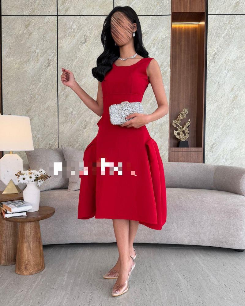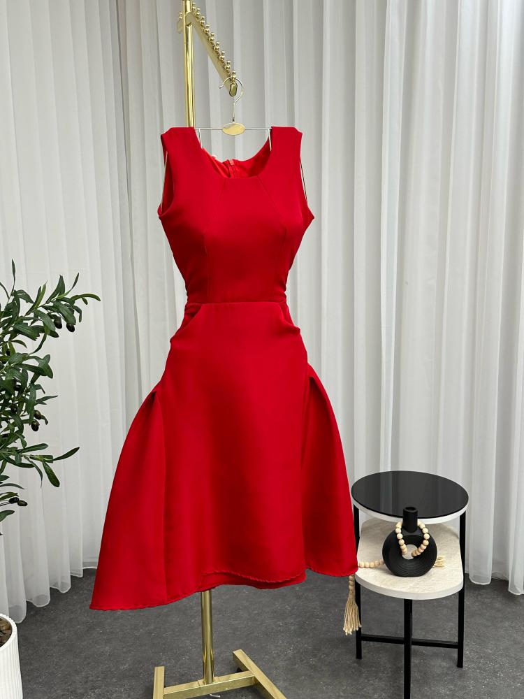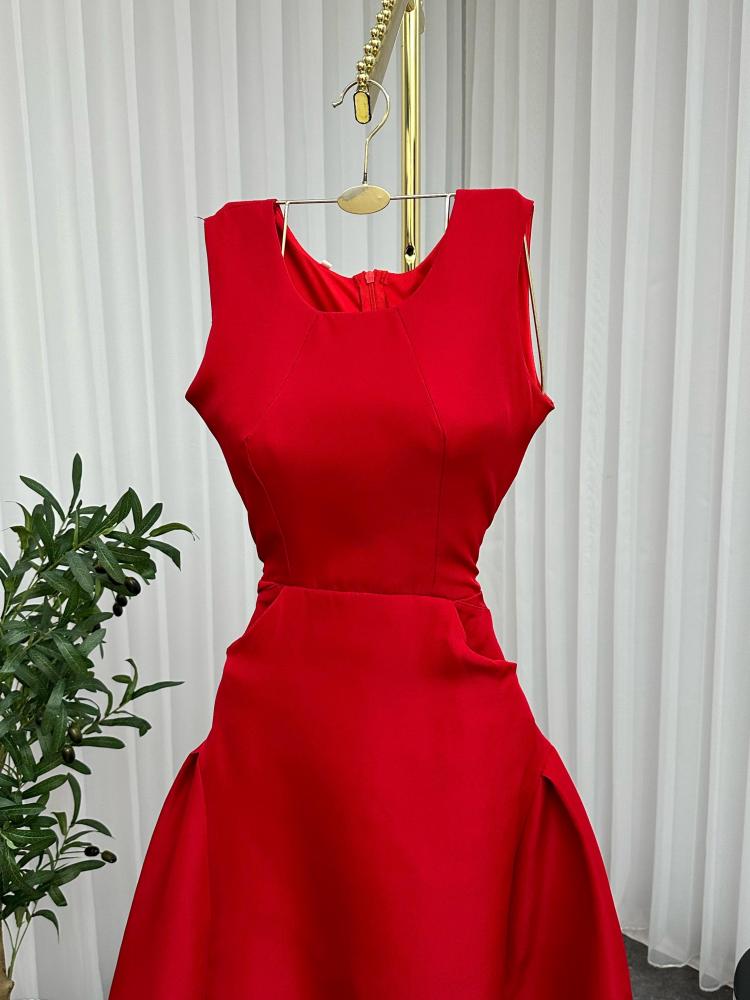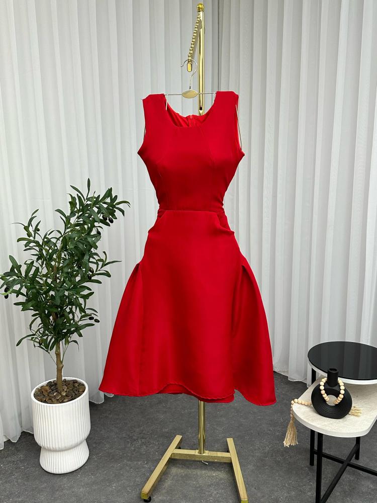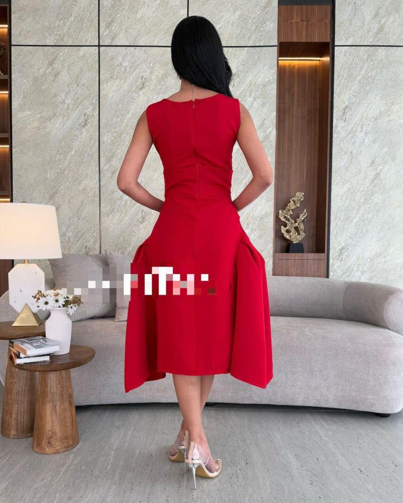 الفستان أنيق وفخم باللون الأحمر، بتصميم كلاسيكي أنثوي. يتميز بقصة ضيقة عند الخصر تبرز القوام، مع تنورة منفوشة قليلاً بطبقات جانبية تمنحه حجماً راقياً.